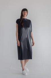Long asymmetric dress in shiny coated stretch lycra.