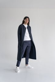 Long straight coat in blue wool and neoprene