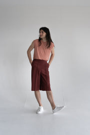 Large bermuda in burgundi ribbed fabric. Hidden elastic waistband