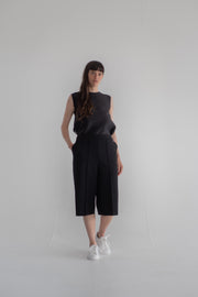 Large bermuda in structured black fabric. Hidden elastic waistband