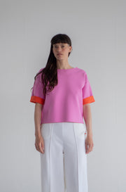 3/4 sleeves top in thick pink and orange double sided neoprene.