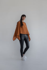 Versatile cognac silk top, with open splits for head and arms. Wearable as top or scarf.