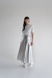 Long wrap skirt in silver coated fabric, white inside.