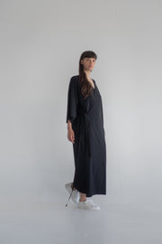 Long wrap dress in black stretch fabric. Wearable in several ways.