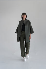 Midlength kimono coat in thick 3D khaki green neoprene.