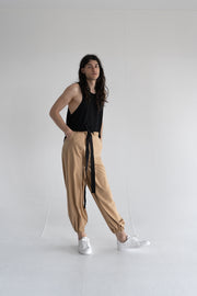 hidden elastic waistband with black closing ribbon, 2 side pockets, elastic ankle-band